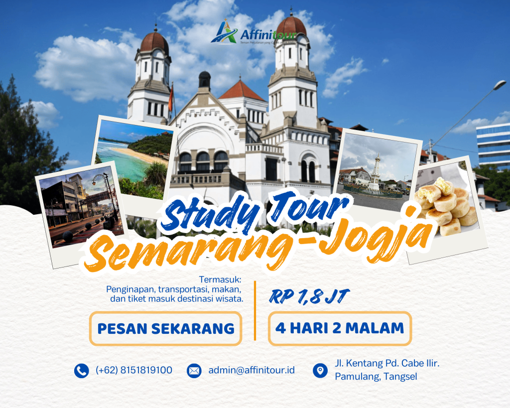 Jelajahi kekayaan budaya dan sejarah Yogyakarta melalui program Study Tour Jogja 4 Hari 2 Malam bersama Affinitour.id. Didampingi tour leader profesional, perjalanan edukatif ini dirancang khusus untuk pelajar agar belajar lebih dalam tentang warisan Indonesia sambil menikmati wisata dengan nyaman, aman, dan menyenangkan.